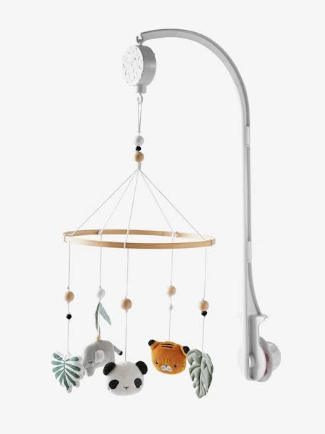 - Mobile musical comprenant 5 suspensions composées de feuilles en coton et d’un éléphant, un tigre et un panda en velours