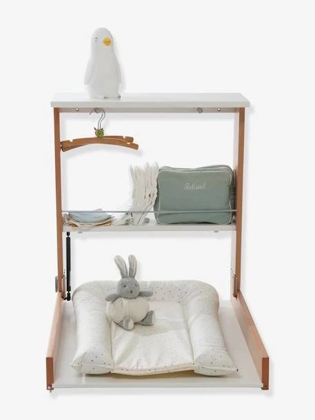 Idéale pour les petits espaces, cette table à langer se fixe au mur et s’ouvre et se ferme d’une seule main ! A l’intérieur, elle dispose d’une tablette de rangement, qui accueille toutes les petites affaires de bébé !